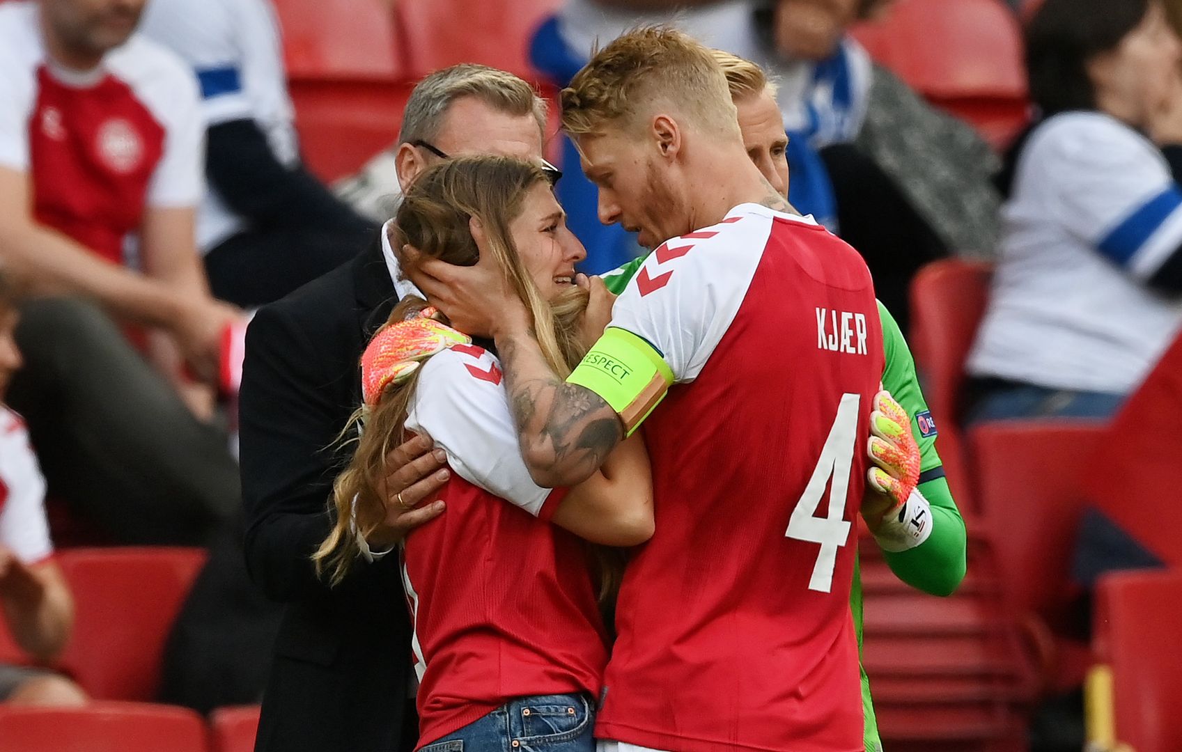 Sabrina kvist jensen, esposa de eriksen, abrazada por simon kjaer y kasper schmeichel en el campo de juego (foto: